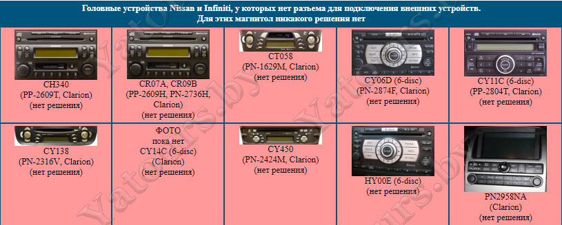 Совместимые головные устройства: BOSE, Clarion, Panasonic. Теперь поддерживаются автомобили, выпущенные для Североамериканского и Канадского рынков.